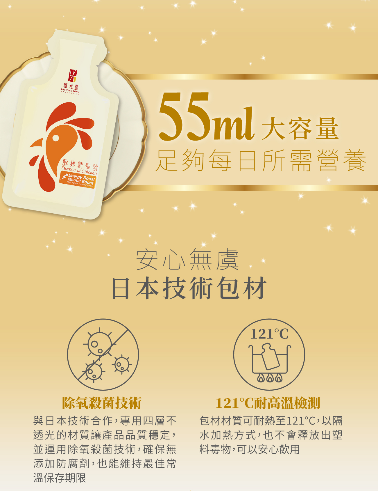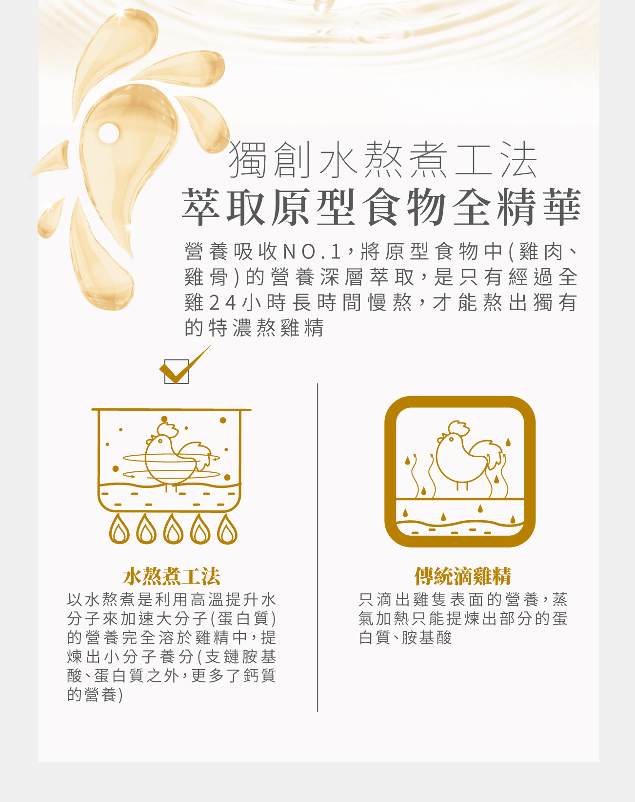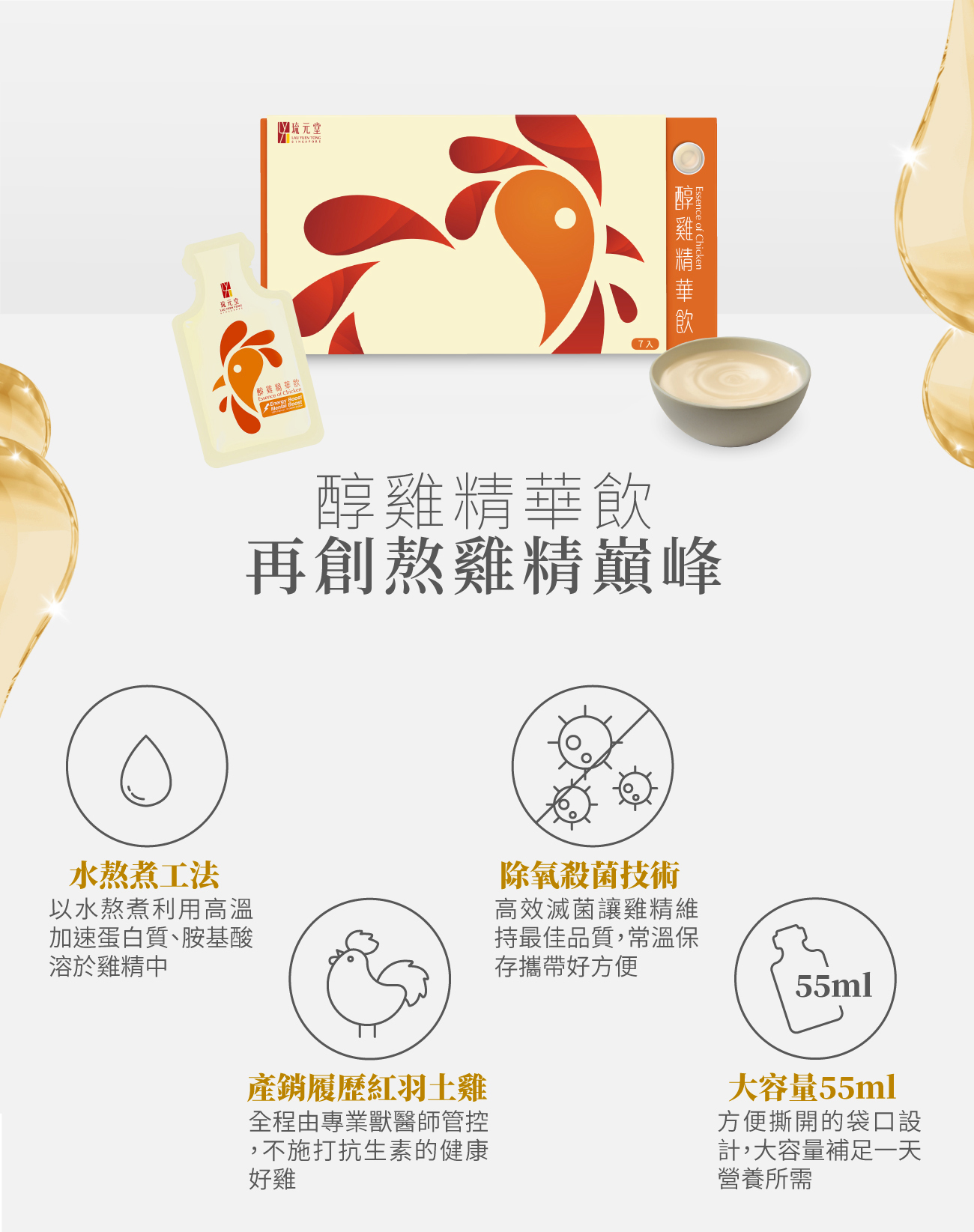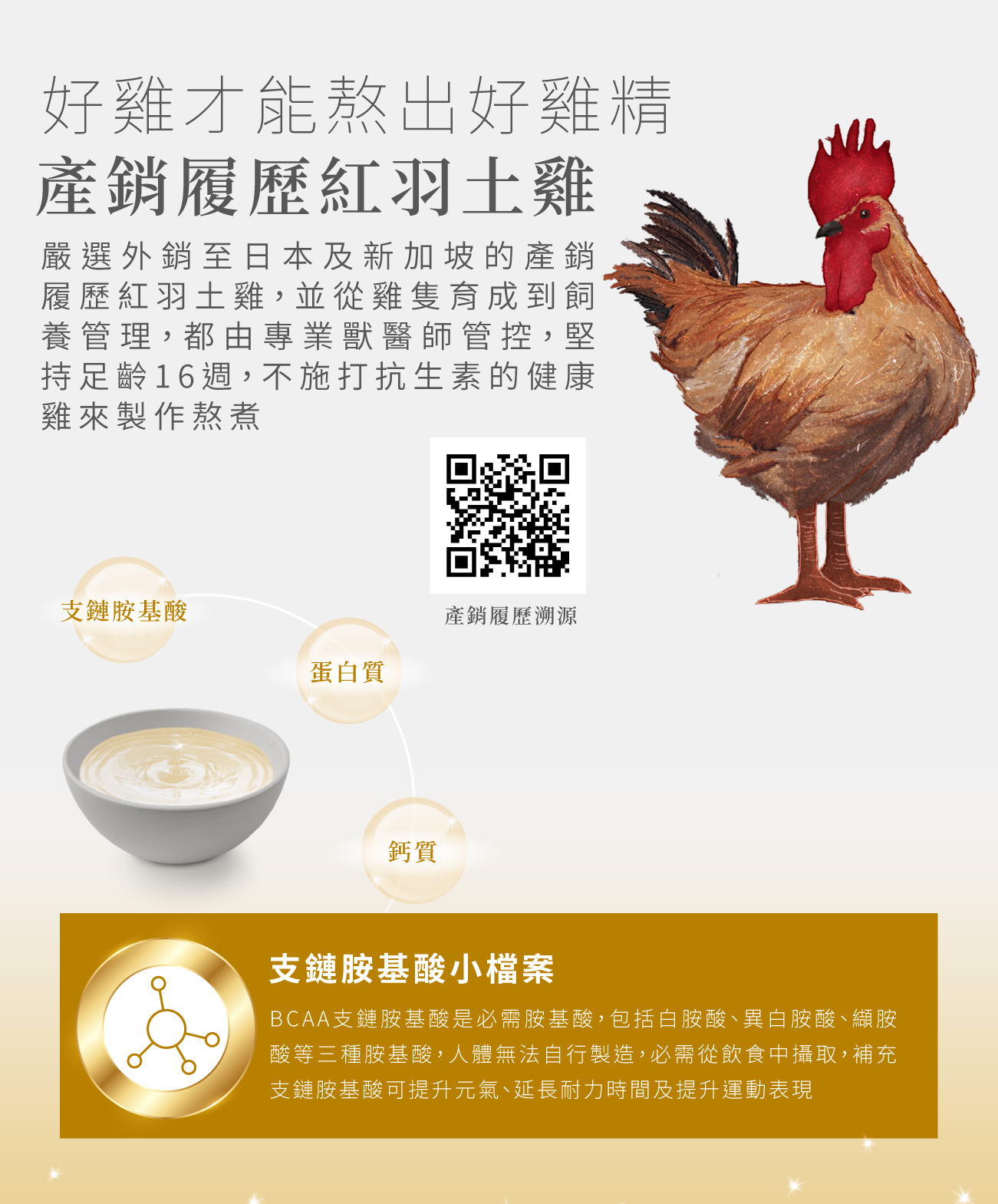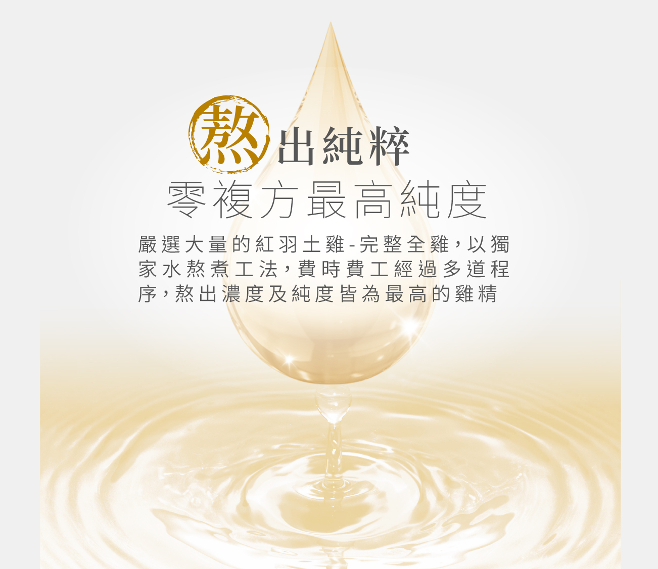 嚴選產銷履歷的紅羽土雞,以水熬煮工法,24小時熬出純粹,再創熬雞精巔峰,費時費工深層熬出雞肉、雞骨營養精華,獨有的乳白色光澤更是好喝營養的保證,原型食物的營養更加完整釋放,熬出更多的必需胺基酸、蛋白質,與傳統滴雞精相比,更多了鈣質營養,是滴雞精升級版,替您守護最愛家人的健康!